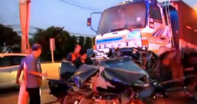 รถบรรทุกพ่วงตู้คอนเทนเนอร์หลับใน ชนสิบล้อจอดติดไฟแดงก่อนไปอัดก๊อบปี้เก๋งคันหน้าอีกที เจ็บติดคาซาก 4 คนเมื่อเช้ามืดที่ผ่านมา