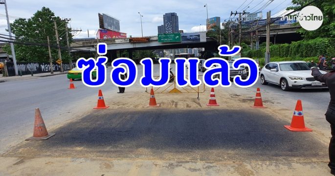 ถนนเพชรบุรี 6 ส.ค.-กทม.ซ่อมถนนทรุดตัวเป็นหลุมยุบบริเวณหน้าอาคารวานิช ถนนเพชรบุรีขาเข้าเสร็จแล้ว พร้อมเปิดจราจรได้ทันเลิกงานเย็นนี้