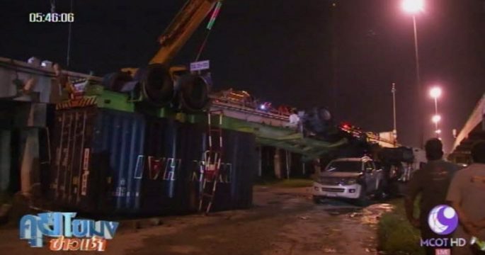รถบรรทุกพ่วง 18 ล้อ ตกสะพานข้ามคลองในเขตสายไหม กทม. ก่อนพุ่งลงมาทับท้ายรถกระบะเสียหาย คนขับรอดปาฏิหาริย์