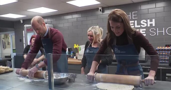 วิลเลียม เจ้าชายแห่งเวลส์ รัชทายาทลำดับที่ 1 แห่งราชวงศ์อังกฤษ และเจ้าหญิงแคทเธอรีนแห่งเวลส์ พระชายา ทรงร่วมกันทำเค้กแบบฉบับเวลส์ ที่ร้านขายขนมปังทางใต้ของเวลส์