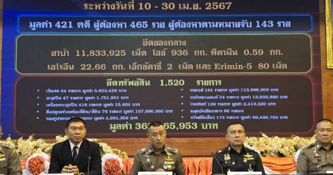 พล.ต.ท.สำราญ นวลมา ผู้ช่วย ผบ.ตร. แถลงผลปิดล้อมตรวจค้นเครือข่ายยาเสพติดทั่วประเทศ ระหว่าง 10-30 เม.ย.67 ยึดทรัพย์สิน 1,520 รายการ มูลค่า 369 ล้านบาท