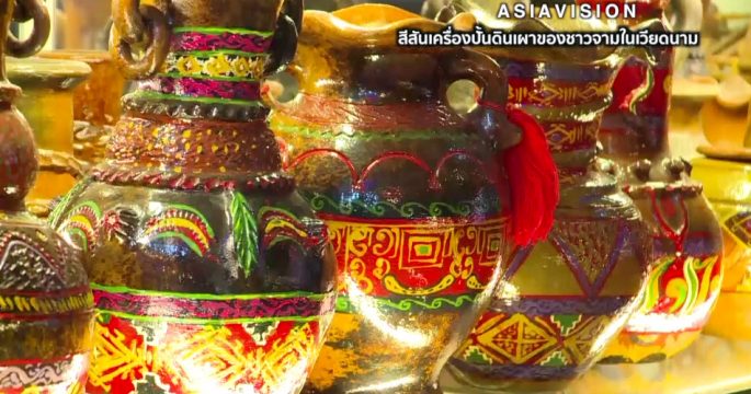 จิตรกรสาวชาวเวียดนามนำเครื่องปั้นดินเผาฝีมือชาวจาม กลุ่มชาติพันธุ์หนึ่งซึ่งเคยรุ่งเรืองในอดีต มาวาดลวดลายระบายสีให้ดูมีชีวิตและจิตวิญญาณแบบงานศิลป์