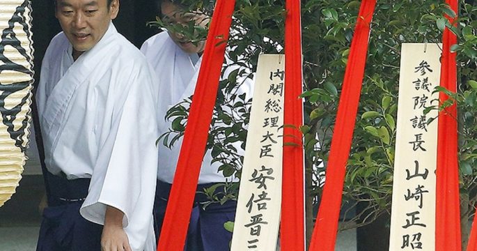 นายกฯ ชินโซ อาเบะส่งเครื่องเซ่นไหว้ศาลเจ้าผู้เสียชีวิตในสงครามโลกครั้งที่ 2 เสี่ยงถูกประท้วงจากจีนและเกาหลีใต้ที่มองว่าเป็นสัญลักษณ์ความโหดร้ายของญี่ปุ่น