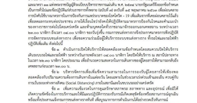 กรุงเทพฯ 16 พ.ค.-กรมรางฯออกมาตรการ สำหรับผู้ใช้บริการระบบรางเพื่อให้สอดรับการให้บริการในวันที่ 17 พ.ค.หลังรัฐลดเวลาเคอร์ฟิวย้ำต้องปฎิบัติเข้มตามมาตราป้องกันเชื้อไวรัสโควิด-19
