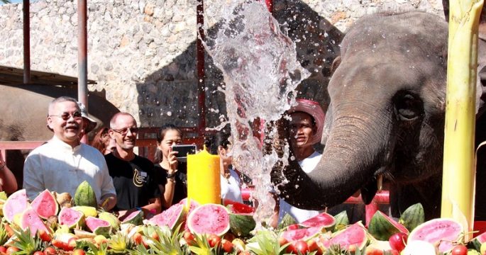 มูลนิธิช้างหัสดินทร์ หัวหิน จัดเต็มอิ่มเค้กผลไม้หนัก 10 ตัน เลี้ยงช้างรับวันช้างไทย 13 มี.ค. นักท่องเที่ยวคึกคัก รวมทั้งควาญช้างคนแรกจากอังกฤษ วัย 93 ปี มาร่วมกิจกรรมด้วย