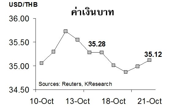 ธนาคารกสิกรไทย ประเมิน สัปดาห์หน้า ( 17-21 ต.ค.)เงินบาทเคลื่อนไหว 34.95-35.50 บาทต่อดอลลาร์ฯหลังสัปดห์ที่ผ่านมาแตะระดับต่ำสุดในรอบ 8 เดือน ด้าน บริษัทหลักทรัพย์กสิกรไทย จำกัด มองว่า ดัชนีหุ้นไทยมีแนวรับที่ 1,450 และ 1,430 จุด ขณะที่ แนวต้านอยู่ที่ 1,490 และ 1,515 จุด ตามลำดับ