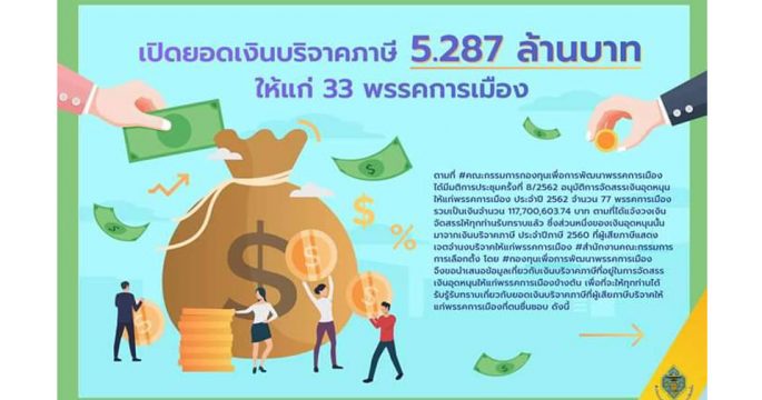 กกต.เปิดตัวเลขเงินภาษีที่ผู้เสียภาษีบริจาคให้แก่พรรคการเมืองที่ตนชื่นชอบ ปชป.ได้มากสุด 4 ล้านบาท รองลงมา พท. ได้ 8 แสนบาท น้อยสุด ผึ้งหลวง ได้ 400 บาท