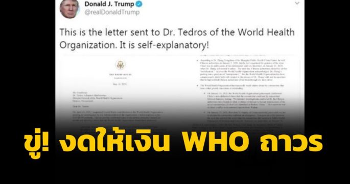 ประธานาธิบดีโดนัลด์ ทรัมป์ของสหรัฐขู่จะระงับการให้เงินสมทบองค์การอนามัยโลกเป็นการถาวร หากไม่มีการปรับปรุงอย่างเป็นรูปธรรมภายใน 30 วัน
