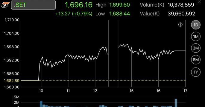 หุ้นไทยฟื้นตัวตามภูมิภาค เหตุเงินเฟ้อสหรัฐออกมาต่ำกว่าที่คาดไว้ ปิดตลาด 1,696.16 จุด บวก 13.27 จุด