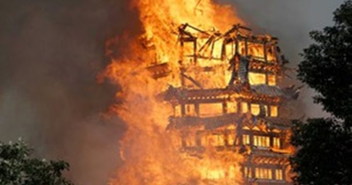 ไฟไหม้เจดีย์โบราณสมัยคริสต์ศตวรรษที่ 16 ในมณฑลเสฉวน ทางตะวันตกเฉียงใต้ของจีนจนเหลือแต่ซาก เหตุเกิดระหว่างการซ่อมแซมเจดีย์ที่เสียหายหนักจากแผ่นดินไหวใหญ่ปี 2551