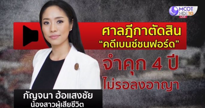 อีก 1 คดีที่มีการพูดถึงกันในวงกว้าง คือ คดีเสี่ยเบนซ์ซิ่งชนท้ายรถฟอร์ด จนทำให้ 2 นิสิตปริญญาโทเสียชีวิต ผ่านมา 1 ปี 4 เดือน วันนี้ศาลจังหวัดพระนครศรีอยุธยาตัดสินจำคุกคนขับ 2 ปี 6 เดือน โดยไม่รอลงอาญา ด้านจำเลยยื่นขอประกันตัว ซึ่งศาลให้ประกันในวงเงิน 300,000 บาท พร้อมยื่นอุทธรณ์ต่อทันที