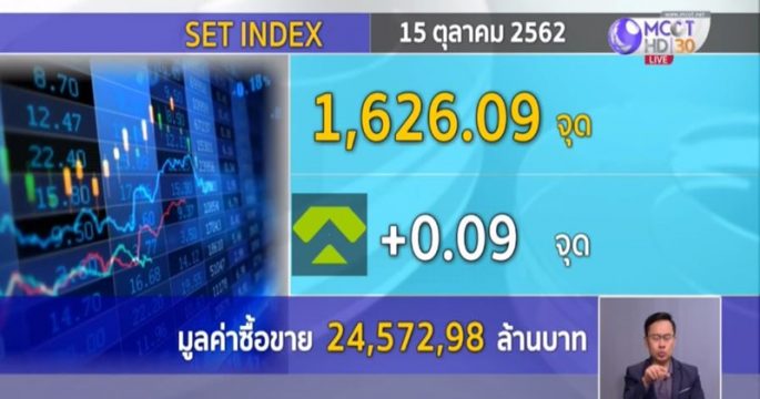 ดัชนีช่วงเที่ยงปิดบวก 0.09 จุด ที่ระดับ 1,626.09 จุด มูลค่าการซื้อขาย 24,572.98 ล้านบาท ตลาดเริ่มผ่อนคลายการเจรจาการค้าระหว่างสหรัฐกับจีน