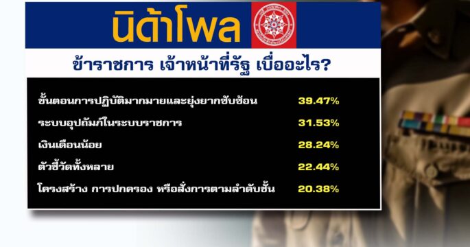 ศูนย์สำรวจความคิดเห็น “นิด้าโพล” เผยผลสำรวจประชาชน เรื่อง “ข้าราชการ เจ้าหน้าที่รัฐ เบื่ออะไร?” เกี่ยวกับความรู้สึกเบื่อของข้าราชการและเจ้าหน้าที่รัฐต่อระบบราชการไทย