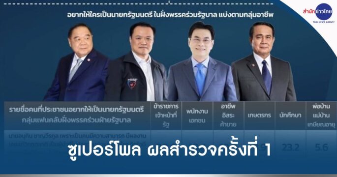 ซูเปอร์โพล เผยโพลเลือกตั้ง ส.ส. ครั้งที่ 1 “อนุทิน-จุรินทร์” ปาดหน้า “ลุงตู่” ครองใจเจ้าหน้าที่รัฐ -เกษตรกร คนอยากเปลี่ยนแปลง มีผลงาน ได้ภาพซื่อสัตย์ ไม่เป็นชนวนความขัดแย้ง ส่วน “อุ๊งอิ๊ง” ได้ใจแฟนคลับเพราะเป็นลูกทักษิณ ชินวัตร เป็นคนรุ่นใหม่ เข้าถึงชาวบ้านไม่ต้องการเห็นการสืบทอดอำนาจ