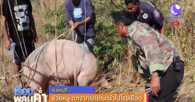 เจ้าหน้าที่กู้ภัยช่วยหมูตกจากรถ ขณะนำส่งโรงเชือด ก่อนที่เจ้าอาวาสวัดในพื้นที่จะรับไปเลี้ยง โชคดีรอดตายส่งท้ายปีเก่า