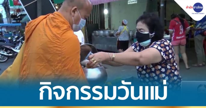 ชาวสงขลาสวมหน้ากากอนามัยทำบุญตักบาตรพระสงฆ์ ถวายเป็นพระราชกุศลเนื่องในวันเฉลิมพระชนมพรรษา 12 สิงหาคม 2564 และวันแม่แห่งชาติ
