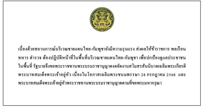 28 ก.ค. – พระบาทสมเด็จพระเจ้าอยู่หัว พระราชทานพระบรมราชานุญาตให้รัฐบาล งดจัดงานสโมสรสันนิบาตเฉลิมพระเกียรติ 28 กรกฎาคม 2568 วันที่ 29 กรกฎาคมนี้ เมื่อวันที่ 28 ก.ค. ผู้สื่อข่าวรายงานว่า รัฐบาลออกประกาศข้อความว่า เนื่องด้วยสถานการณ์บริเวณชายแดนไทย-กัมพูชา ยังมีความรุนแรง ส่งผลให้ข้าราชการ พลเรือน ทหาร ตำรวจ ต้องปฏิบัติหน้าที่ในพื้นที่บริเวณชายแดนไทย-กัมพูชา เพื่อปกป้องดูแลประชาชนในพื้นที่ รัฐบาลจึงขอพระราชทานพระบรมราชานุญาตงดจัดงานสโมสรสันนิบาตเฉลิมพระเกียรติพระบาทสมเด็จพระเจ้าอยู่หัว เนื่องในโอกาสเฉลิมพระชนมพรรษา 28 กรกฎาคม 2568 และพระบาทสมเด็จพระเจ้าอยู่หัวพระราชทานพระบรมราชานุญาตตามที่ขอพระมหากรุณา .-312-สำนักข่าวไทย