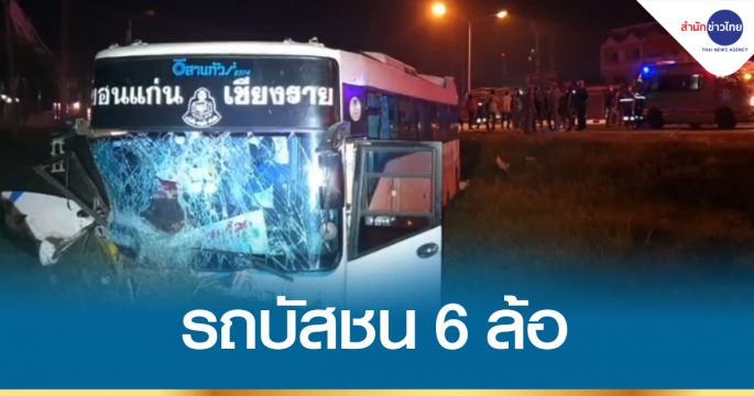 รถบัสโดยสารเฉี่ยวชนรถ 6 ล้อ บรรทุกดิน เหินข้ามเกาะกลางลงข้างถนน คนขับเสียชีวิต 1 ราย ผู้โดยสารเจ็บ 5 ราย
