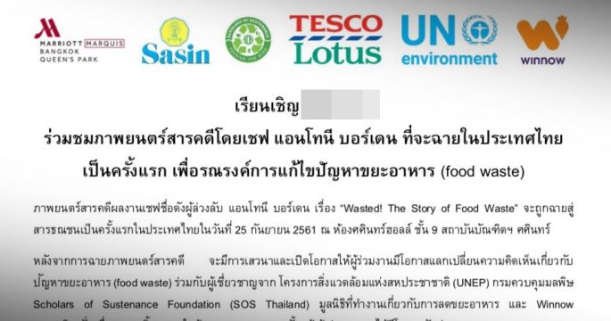 หลายหน่วยงานร่วมจัดฉายภาพยนตร์สารคดีผลงานเชฟชื่อดังผู้ล่วงลับ ‘แอนโทนี บอร์เดน’ เรื่อง Wasted!The Story of Food Waste 25 ก.ย.นี้ มุ่งรณรงค์แก้ไขปัญหาขยะอาหาร