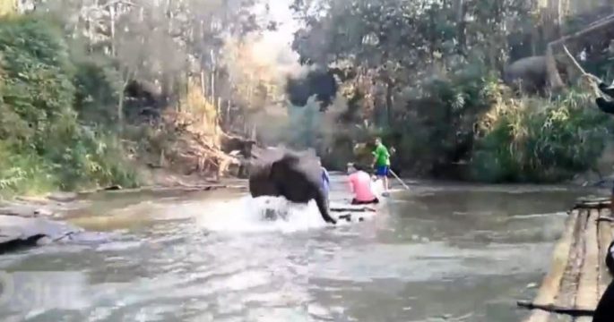 นาทีระทึก! ช้างวิ่งลงไปพุ่งชนแพนักท่องเที่ยวที่กำลังล่องอยู่ในลำน้ำแม่วาง จ.เชียงใหม่ นักท่องเที่ยวบนแพ 5 คน ตกน้ำและตื่นตกใจหนีเอาชีวิตรอด มีนักท่องเที่ยวหญิงบาดเจ็บ 1 ราย