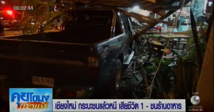 หนุ่มซิ่งกระบะพุ่งชนรถที่จอดข้างทาง จนชายที่ยืนโทรศัพท์อยู่ข้างรถเสียชีวิต 1 ราย แล้วขับหลบหนี เสียหลักพุ่งชนร้านอาหารกลางเมืองเชียงใหม่ ทำให้มีผู้ได้รับบาดเจ็บอีก 4 ราย