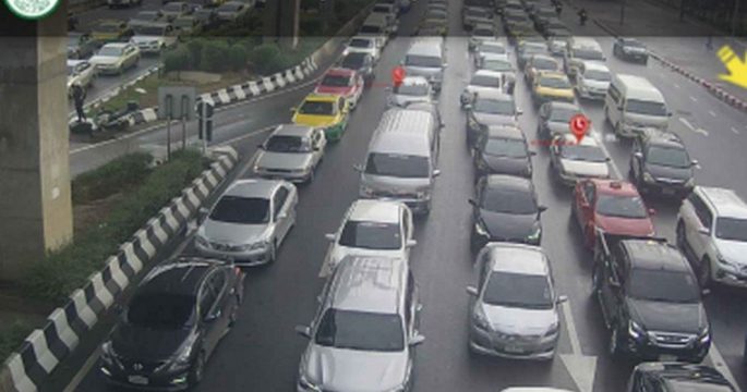 สวพ.FM 91 รายงานจราจรเช้าวันจันทร์ ถนนวิภาวดี-รังสิต ขาเข้า มุ่งหน้าไปใต้ด่วนดินแดง รถติดขัด ท้ายสะสมอยู่ที่หน้า ม.หอการค้าไทย