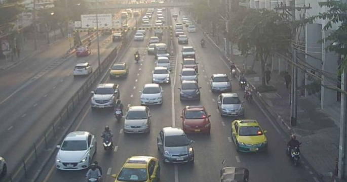 การจราจรเช้าวันจันทร์ ถนนรัชดาภิเษก ขาเข้า จากแยกเทียมร่วมมิตร มุ่งหน้าแยกพระราม9 เข้าถนนอโศกมนตรี รถมาก เคลื่อนตัวช้า