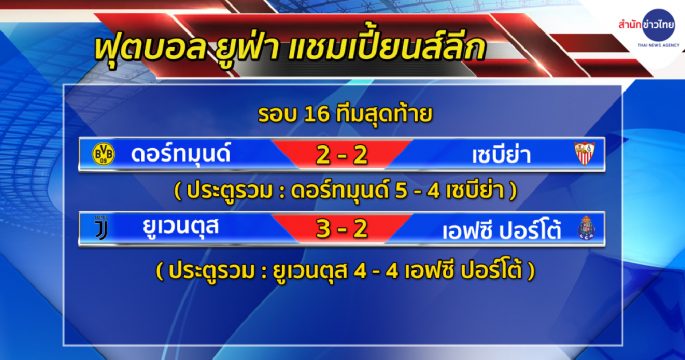 ผลฟุตบอลยูฟ่า แชมเปียนส์ ลีก รอบ 16 ทีม เมื่อคืนนี้ ลงสนาม 2 คู่ โดย โบรุสเซีย ดอร์ทมุนด์ ทะลุเข้ารอบ 8 ทีมสุดท้าย ขณะที่ “ม้าลาย” ยูเวนตุส ตกรอบ