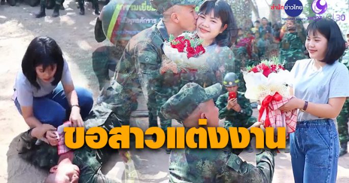 ทหารใหม่ทำเซอร์ไพรส์แฟนสาว แกล้งเป็นลม ก่อนขอแต่งงานกลางงานพบญาติทหารใหม่ โดยมีสักขีพยาน เป็นเพื่อนทหารทั้งกอง รวมทั้งญาติพี่น้องของของทหารใหม่ที่มาร่วมงาน หลายร้อยคน