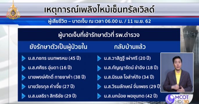 โรงพยาบาลตำรวจ รายงานผู้บาดเจ็บที่จากเหตุเพลิงไหม้ที่เข้ารับการรักษาและอนุญาตให้กลับบ้านได้