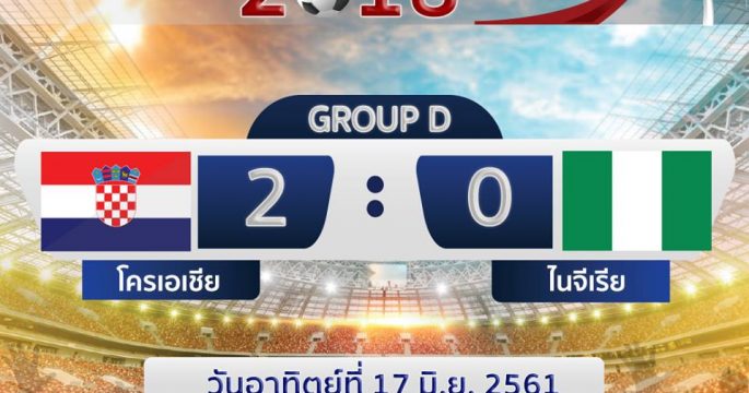 สรุปผลบอลเมื่อคืนที่ผ่านมา กลุ่มดี อาร์เจนติน่า เสมอ ไอซ์แลนด์ 1-1 ด้าน โครเอเชีย ชนะ ไนจีเรีย 2-0 ขึ้นนำจ่าฝูงของกลุ่ม ส่วนกลุ่มซี ฝรั่งเศส ชนะ ออสเตรเลีย 2-1, เปรู แพ้ เดนมาร์ก 0-1