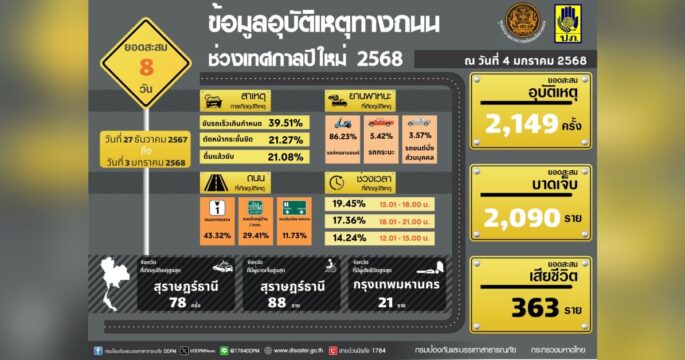 ศปถ. รายงาน 10 วันอันตรายปีใหม่ รวม 8 วัน เสียชีวิตแล้ว 363 ราย บาดเจ็บ 2,090 คน สาเหตุจากขับรถเร็ว กทม. แชมป์เสียชีวิตสูงสุด