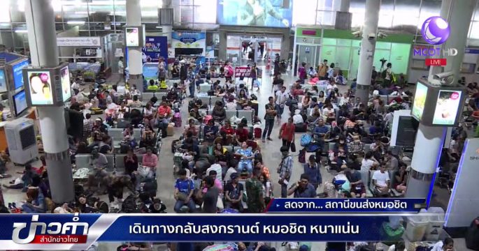 การเดินทางกลับภูมิลำเนาช่วงเทศกาลสงกรานต์ที่สถานีขนส่งหมอชิตใหม่หนาแน่น บขส. ประเมินว่าค่ำคืนนี้จะมีผู้โดยสารมาใช้บริการมากกว่า 200,000 คน