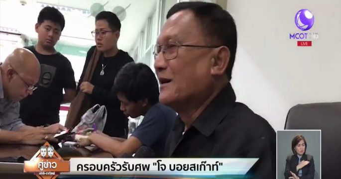 ศพของ “โจ บอยสเก๊าท์ ” ที่สวมเสื้อคลุมและหมวก ซึ่งเป็นชุดเล่นคอนเสิร์ตครั้งสุดท้ายในสถานบันเทิงแห่งหนึ่ง ก่อนเกิดอาการวูบและเสียชีวิตอย่างกระทันหันเมื่อคืนที่ผ่านมา ถูกเคลื่อนออกจากสถาบันนิติเวช โรงพยาบาลตำรวจ