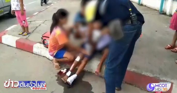 เจ้าหน้าที่กู้ภัยชีพเร่งปฐมพยาบาลเด็กหญิงเมตาจา อายุ 9 ปี เด็กหญิงต่างด้าวที่ถูกรถยนต์ชนทับข้อเท้าซ้ายกระดูกแตก อาการสาหัส บนถนนสายแม่สอด-ตาก