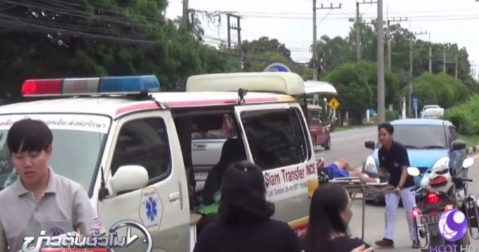 พลเมืองดีช่วยกันประคองตัวเด็กนักเรียนชายวัย 13 ปี ที่บาดเจ็บสาหัสขยับตัวไม่ได้ หลังประสบอุบัติเหตุรถจักรยานยนต์ชนรถยนต์ที่กำลังเลี้ยวเข้าหมู่บ้านใน จ.เชียงใหม่