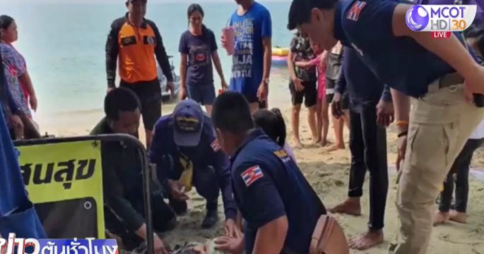 เจ้าหน้าที่ป้องกันและบรรเทาสาธารณภัยเทศบาลเมืองแสนสุข จังหวัดชลบุรี เร่งปฐมพยาบาลเด็กชายวัย 2 ขวบ ที่ผู้ปกครองเพิ่งช่วยเหลือขึ้นมาจากการจมน้ำ ระหว่างลงเล่นน้ำทะเลที่หาดบางแสน แล้วเห็นว่าเด็กชายซึ่งสวมเสื้อชูชีพ อยู่ในสภาพคว่ำหน้าลงกับน้ำทะเล
