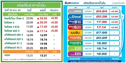 ปตท.-บางจากฯ ปรับราคาขายปลีกน้ำมันกลุ่มเบนซินทุกชนิดขึ้น 0.50 บาทต่อลิตร เว้น E85 ปรับขึ้น 0.30 บาทต่อลิตร ส่วนกลุ่มดีเซลทุกชนิดปรับขึ้น 0.30 บาทต่อลิตร มีผลพรุ่งนี้