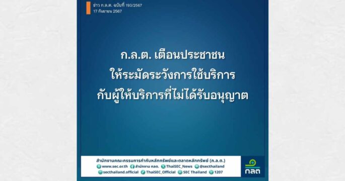 ก.ล.ต.เตือนประชาชนระวังการใช้บริการกับผู้ให้บริการที่ไม่ได้รับอนุญาต