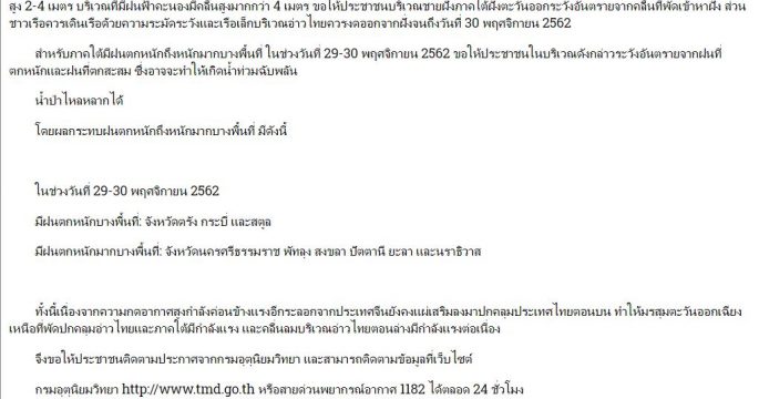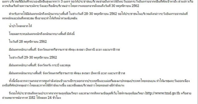 อุตุฯ เตือนภาคใต้ฝนตกต่อเนื่อง ตกหนักบางพื้นที่ ระวังน้ำท่วม น้ำป่าหลาก อ่าวไทยคลื่นสูง 2-4 เมตร ชายฝั่งภาคใต้ฝั่งตะวันออกระวังอันตรายจากคลื่นซัดเข้าหาฝั่ง สำหรับประเทศไทยตอนบนมีอากาศหนาวเย็นในตอนเช้า ยอดดอย-ยอดภูมีอากาศหนาวถึงหนาวจัด อุณหภูมิต่ำสุด 8-15 องศาฯ