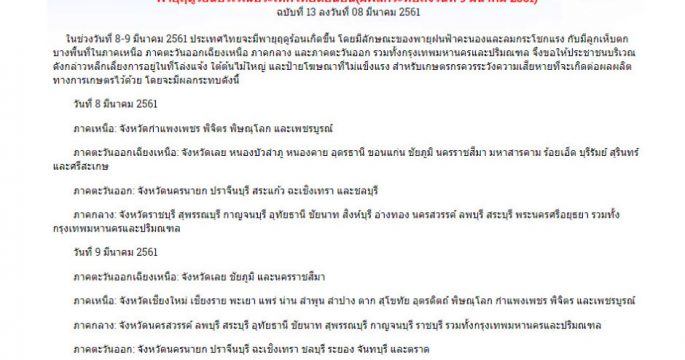 กรมอุตุนิยมวิทยาประกาศเตือนพายุฤดูร้อนบริเวณประเทศไทยตอนบน ฉบับที่ 13 ลงวันที่ 08 มีนาคม 2561 มีผลกระทบถึงวันที่ 9 มีนาคม