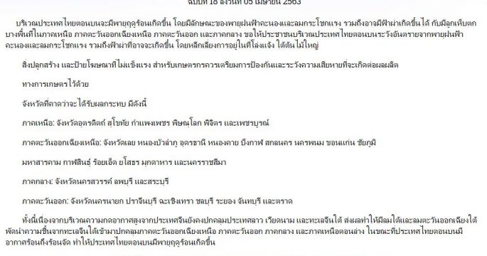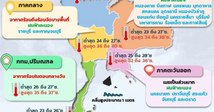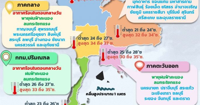 อุตุฯ เตือนช่วงวันที่ 20-23 มี.ค. ไทยตอนบนมีพายุฤดูร้อน ฝนฟ้าคะนอง ลมกระโชกแรง กับมีลูกเห็บตกบางพื้นที่ และอาจมีฟ้าผ่าเกิดขึ้นได้