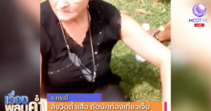 นักท่องเที่ยวหญิง ชาวรัสเซีย ถูกลิงในวัดถ้ำเสือวิปัสนา ที่จังหวัดกระบี่กัด ได้รับบาดเจ็บ เป็นแผลฉกรรจ์ 3-4 จุด ขณะเดินเที่ยวชมภายในบริเวณวัด