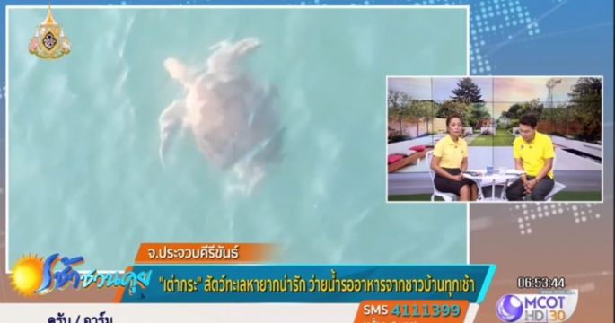 พบ “เต่ากระ” อายุประมาณ 2-3 ปี ว่ายน้ำรอชาวบ้านใจดีโยนปลาหมึกให้กินทุกเช้า บริเวณสะพานชายทะเลทับสะแก อ.ทับสะแก จ.ประจวบคีรีขันธ์