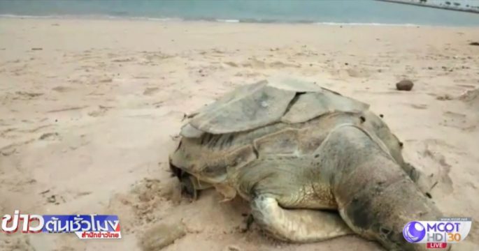 พบซากเต่าตนุเพศเมีย อายุ 20 ปี เกยตื้นริมหาดกินรี อ.สัตหีบ จ.ชลบุรี ชันสูตรพบขยะทะเลในระบบทางเดินอาหาร และสิ่งแปลกปลอม ทั้งใบตอง หมุด ตะปู จากกระทง อุดตันลำไส้