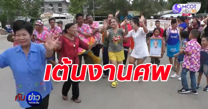 งานศพชายวัย 81 ปี คึกคัก ญาติ-คนรู้จัก แต่งกายด้วยเสื้อผ้าลายดอกสีฉูดฉาด ทั้งเต้นทั้งรำ ตีกลองยาว นำขบวนบรรทุกศพวนรอบเมรุกันอย่างสนุกสนาน ลูกชายแจงทำตามสั่งเสียพ่อ