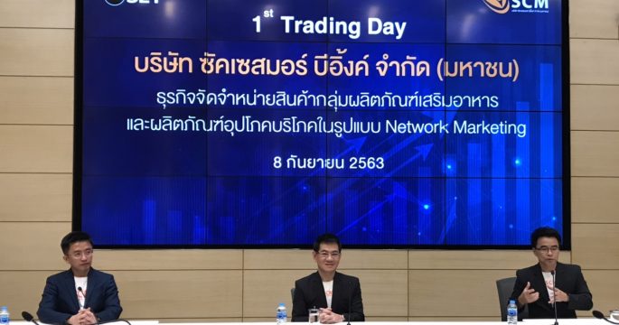 หุ้นน้องใหม่ SCM ของ บมจ. ซัคเซสมอร์ บีอิ้งค์ ผู้ดำเนินธุรกิจจำหน่ายสินค้าในกลุ่มผลิตภัณฑ์อุปโภคบริโภคทั้งในและต่างประเทศในลักษณะเครือข่ายขายตรง บริษัทแรกที่เข้าระดมทุนในตลาดหลักทรัพย์ฯ วันแรกวันนี้ (8 ก.ย.63)ด้วยมูลค่าหลักทรัพย์ ณ ราคา IPO 1,140 ล้านบาท โดยราคาเปิดซื้อขายวันแรกอยู่ที่ 2.88 บาท บวก 51.58% จากราคา IPO หุ้นละ 1.90 บาท