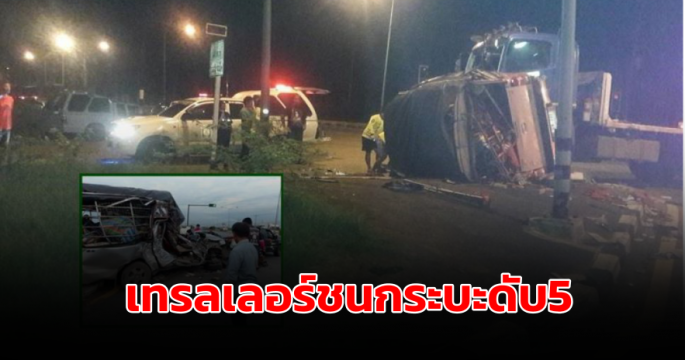 เกิดอุบัติเหตุสลดเช้ามืด กลางแยกบายพาสท่าวุ้ง-ลพบุรี เทรลเลอร์ชนรถกระบะพังทั้งคันดับ 5 เจ็บอีก 1