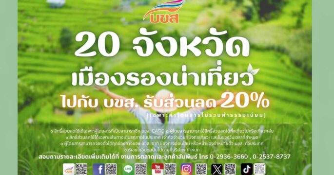 วันที่ 15-31 ส.ค.นี้ นั่งรถทัวร์ บขส. เที่ยวเมืองรองภาคอีสาน-ตะวันออก รับส่วนลดค่าโดยสาร 20% เผยยอดคนใช้บริการช่วงหยุดยาวคึกคักแตะ 1 แสนคน