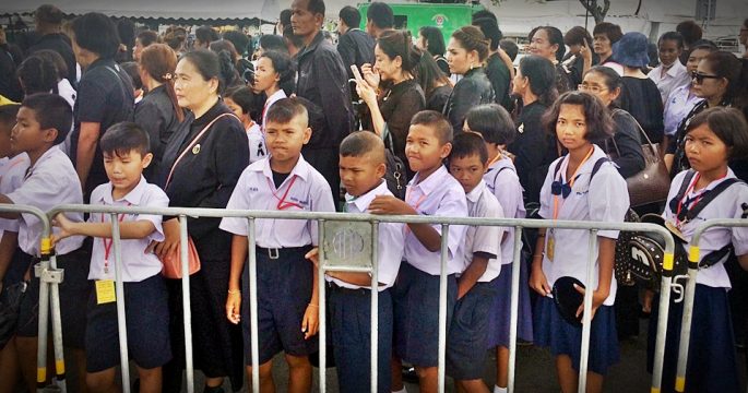 ประชาชนที่เข้าแถวรอกราบถวายบังคมพระบรมศพ พระบาทสมเด็จพระปรมินทรมหาภูมิพลอดุลยเดช ขบวนสุดท้ายเมื่อคืนนี้ คือ เวลา 02.56 น. จากกำหนดเดิมเวลาที่สำนักพระราชวังจะปิดในเวลา 21.00 น.